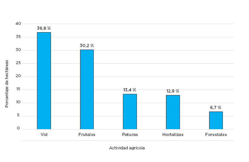 Se trata de unas 143.000 ha empadronadas de las cuales unas 41.601 ha poseen derechos de riego superficial. Estas se reparten en un área de 20 Inspecciones de Cauce. De la zona involucrada, el 94% es utilizado para actividades agrícolas, mientras que el resto se ocupa básicamente en construcciones e infraestructura, cuerpos de agua y vegetación natural. En la siguiente figura se puede apreciar una síntesis porcentual de superficies agrícolas en producción correspondiente a la subcuenca del río Tunuyán en su tramo Superior.