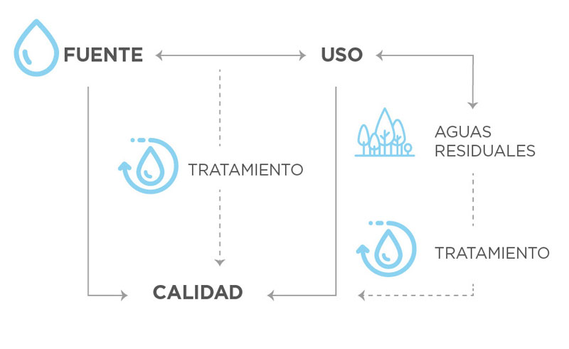 De acuerdo al uso, habrá ciertos constituyentes que pueden permanecer y otros que deben eliminarse, lo que a su vez se relaciona con las características de la fuente de agua de la que se dispone. Además, cada “uso” aporta constituyentes propios y genera aguas residuales que también deben ser tratadas antes de ser vertidas a un cuerpo receptor. De este modo no desmejora la calidad de la fuente y tampoco perjudica usos posteriores. En la figura siguiente se muestra esquemáticamente esta interrelación.