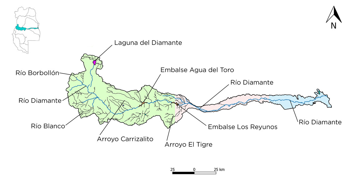 - Cuenca Alta:el río Diamante nace en la laguna del mismo nombre, ubicada al pie del volcán Maipo (Departamento de San Carlos). El mismo discurre en dirección Sur hasta la confluencia con el río Borbollón, que es el principal tributario y tiene su origen en la zona denominada como La Rinconada. Aguas abajo de esta confluencia el río Diamante cambia de dirección hacia el Sud- Este donde recibe, por margen derecha, el aporte de dos importantes ríos: el Negro y el Blanco y en menor medida, Las Aucas. Posteriormente, describe una amplia curva hacia el Noreste, para luego recibir los aportes del arroyo Hondo a la altura de la presa Agua del Toro. La cuenca de recolección del río Diamante abarca una superficie aproximada de 5.100 km2 y 73 km de frente a la Cordillera Principal. Los valles son típicos de ambiente montañoso: estrechos, de pendientes abruptas y procesos erosivos predominantes.