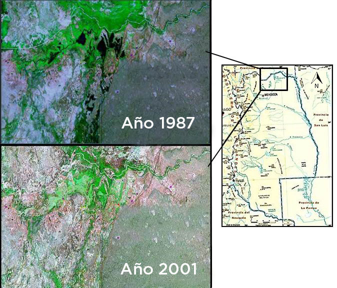 - Año 1987: se observa de color negro las lagunas, Laguna del Rosario, pertenecientes al sistema de Guanacache.