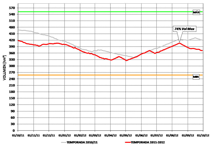 A continuación se presentan en forma gráfica mediciones de un embalse correspondiente a la temporada 2012/2013. Se aprecia, en forma comparativa, los volúmenes de la temporada 2010/2011 y los volúmenes históricos.